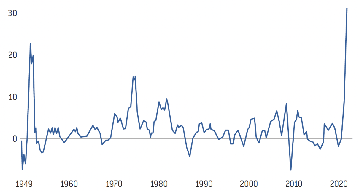b) L’évolution de l’inflation n’est ni linéaire ni rapide, certaines choses sont différentes, mais le phénomène est relativement similaire. L’histoire semble donc se répéter. On voit que cette inflation a duré, pendant une quinzaine d’années, et qu’elle n’a pas connu une évolution linéaire mais irrégulière. Ces deux constats sont importants. L’inflation que nous vivons actuellement se situe entre 5 % et 10 %. Le pic à 15 % ne paraît pas impossible. Au Royaume-Uni, on est déjà à 12 % environ et en zone euro, autour de 10 %. Cela montre les aspects instables de la situation qui doivent nous mettre en garde contre l’affirmation selon laquelle une inflation à 7,2 % est une bonne surprise en comparaison de l’estimation faite à 7,3 %. Cette différence, d’une part, ne représente même pas la marge d’erreur et d’autre part, l’histoire nous a montré que l’inflation oscille.