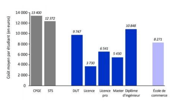 Le Conseil d’analyse économique (CAE) s’est intéressé, dans une note publiée fin 2021, au coût réel de la formation d’un étudiant en France, par filière. Avec un parti pris original: exclure les frais de recherche et d’organisation (administration, orientation…) pour ne se concentrer que sur les dépenses de formation. Le résultat montre un grand niveau de disparité selon le cursus. Ainsi, un étudiant de licence coûte en moyenne 3.730 euros par an, quand le futur ingénieur atteint 10.850 euros, et un élève de classe prépa 13.400 euros. Pour les écoles de commerce, le CAE l’évalue à 8.270 euros. En ajoutant les dépenses de recherche, autour de 33% des coûts, le montant grimpe à 12.345 euros par an par étudiant. Comment expliquer ces écarts?
