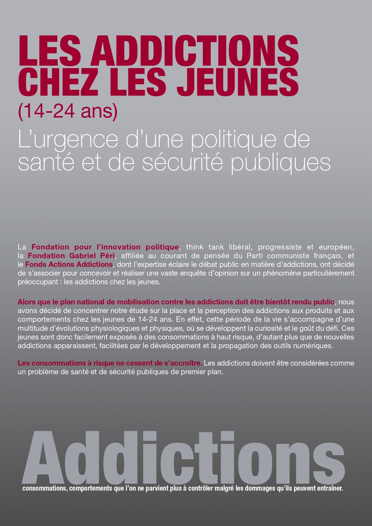 Fonds Actions Addictions, Fondation Gabriel Péri, Fondation pour l’innovation politique, Les addictions chez les jeunes (14-24 ans), (Fondation pour l’innovation politique, juin 2018).
