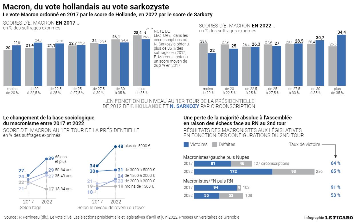 Entre les votes Macron du premier tour de 2017 et ceux de 2022, les changements sont considérables et conduisent à distinguer trois périodes. À la présidentielle de 2017, il représente le vote d’une France dynamique, aisée, cultivée, habitant souvent dans les grandes villes et laissant à François Fillon le soutien de la France riche et âgée. Dès les législatives de 2017, après l’entrée d’Édouard Philippe, Bruno Le Maire et Gérald Darmanin au gouvernement, la France aisée, rassurée sur la ligne politique du quinquennat qui s’engage, rejoint en large partie le vote En marche.