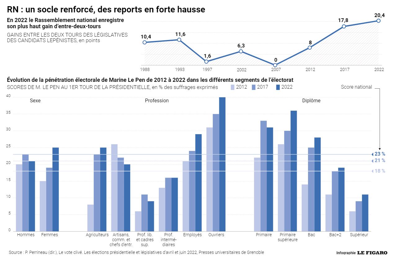 Les législatives de 2022 ont parallèlement témoigné de la normalisation croissante du parti de Marine Le Pen. En dépit d’une campagne à bas bruit, la formation lepéniste y a réalisé une performance historique avec pas moins de 89 députés.