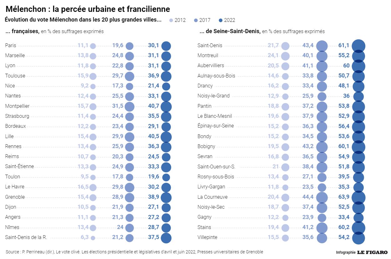 La situation de Paris, dont la sociologie politique des arrondissements est si parlante, illustre bien cette mutation. En cinq ans, d’un premier tour de présidentielle à l’autre, le vote Macron recule fortement dans les 20e, 19e et 18e arrondissements, devenus ceux des classes moyennes diplômées à revenus intermédiaires qui basculent dans le vote Mélenchon.