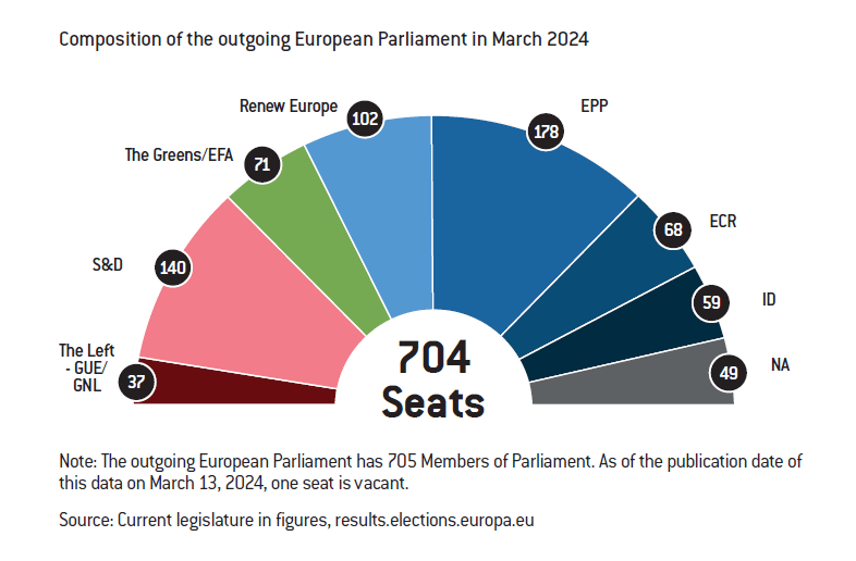 • Two major groups (EPP and S&D) are expected to maintain strong positions (Renew and the Greens are projected to experience significant losses according to current projections).