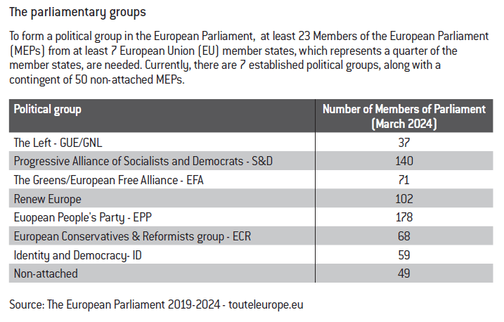 • The second, more radical group is ID (Identity and Democracy), whose mainstays are the Lega, RN (Rassemblement National) and AFD (Alternative for Germany). It has approximately sixty elected members.
