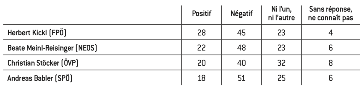 Ils ont pris comme base d’analyse les débats estivaux de l’ORF1 qui virent les chefs de partis décliner leurs politiques futures et leur vision de l’avenir. Les réponses des personnes interrogées étaient ventilées en trois catégories : « convaincantes », « crédibles » et « sympathiques ». Andreas Babler (SPÖ) fut jugé le moins « convaincant » et a également terminé dernier en matière de crédibilité. En termes de sympathie, il s’est classé devant Kickl, à l’avant-dernière place. C’est le chancelier fédéral Christian Stocker (ÖVP) qui obtenait les meilleurs résultats en matière de sympathie (59% contre 35% d’opinions négatives). Herbert Kickl enregistrait ses meilleurs résultats dans les catégories « convaincant » (68% « d’accord » contre 25% « pas d’accord ») et « crédible » (63% des personnes interrogées contre 30%). En revanche, il terminait dernier en matière de sympathie.