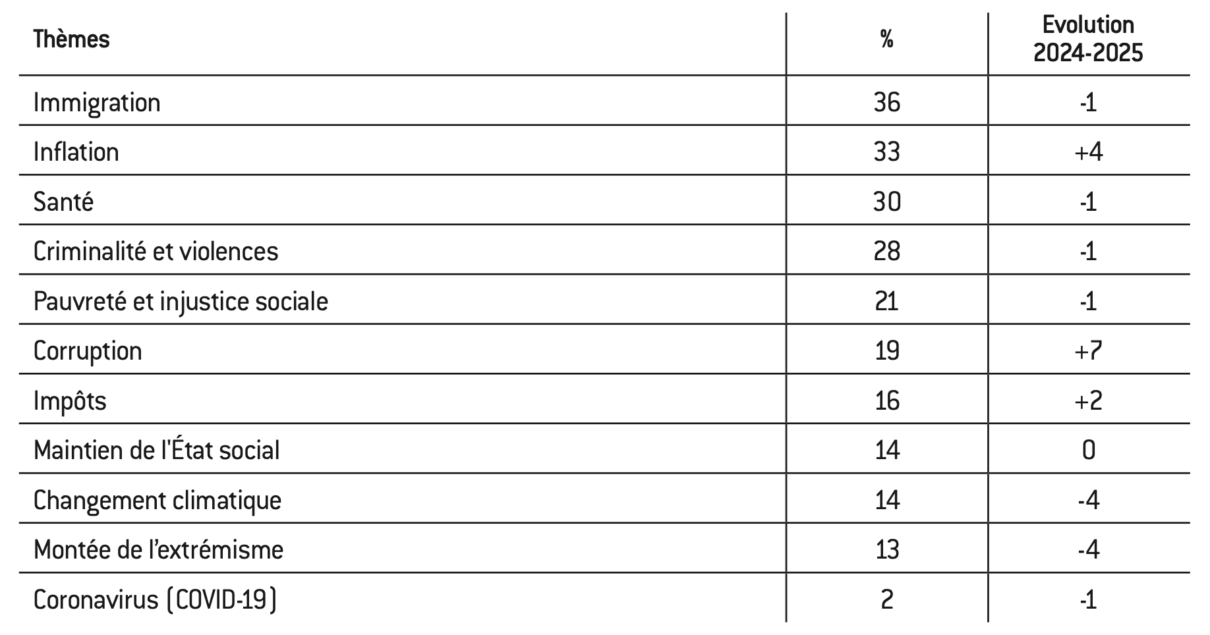Accompagnant l’inflation, la crainte d’une augmentation des impôts (16%) est à nouveau plus présente dans la population. 13% des personnes interrogées ont peur d’une montée de l’extrémisme, une diminution par rapport à l’enquête de 2024 et un recul à la 10ème place contre la 6ème auparavant. Parallèlement, les inquiétudes liées à la criminalité diminuent, mais restent dans le top 5 des préoccupations (28%).