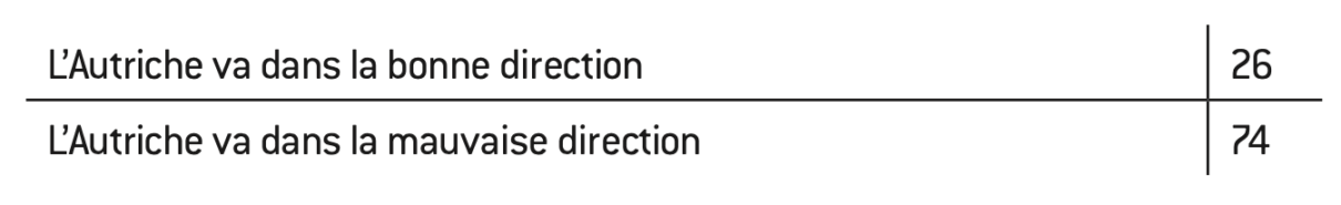 La situation économique est jugée mauvaise par 85% des sondés. 74% de la population estiment que l’Autriche va mal. Seules les personnes âgées sont un peu plus optimistes, 36% d’entre elles estimant que l’Autriche est sur la bonne voie9.