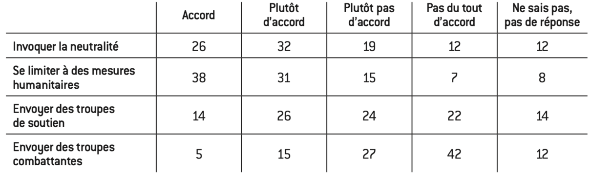 L’enquête de 2024, résumée dans le tableau, montre que la solidarité avec un autre État membre de l’UE victime d’une agression militaire est faible : 58% des sondés souhaitent invoquer la neutralité et 69% se limiter à des mesures humanitaires. Cette étude montre aussi que 57% des personnes interrogées veulent un maintien de la neutralité sous sa forme actuelle, et près des deux tiers des personnes interrogées sont contre l’adhésion à l’alliance militaire de l’OTAN. L’étude montre enfin que 80% des sondés considèrent la neutralité comme faisant partie de l’identité de l’État. Une thèse que Kickl défendra devant les délégués de son parti.