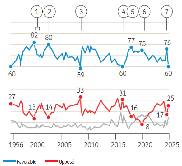 „EU-Befürwortung in Österreich auf zweitniedrigstem Wert seit 1995“, DerStandard, 28 décembre 2024 [en ligne]. 1 : À partir de février 2000, les sanctions de l’UE contre l’Autriche ; 2 : Juillet 2002, fin de l’alliance ÖVP-FPÖ et débat sur l’introduction de l’Euro ; 3 : Juillet 2008, débats sur le traité de Lisbonne ; 4 : Juillet 2016, Brexit ; 5 : Décembre 2017, mise en place gouvernement Kurz (ÖVP-FPÖ) ; 6 : Février 2020, début de la pandémie ; 7 : Juin 2024, victoire du FPÖ aux Européennes.