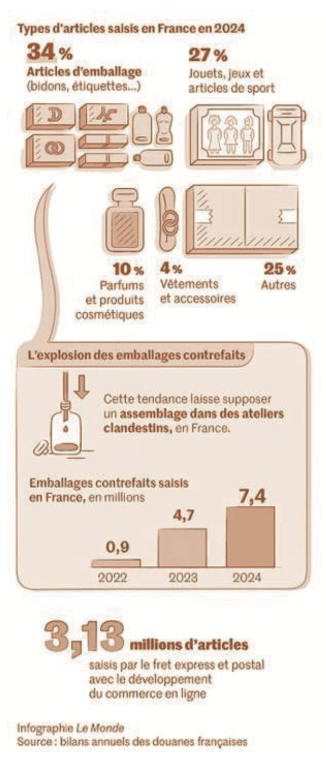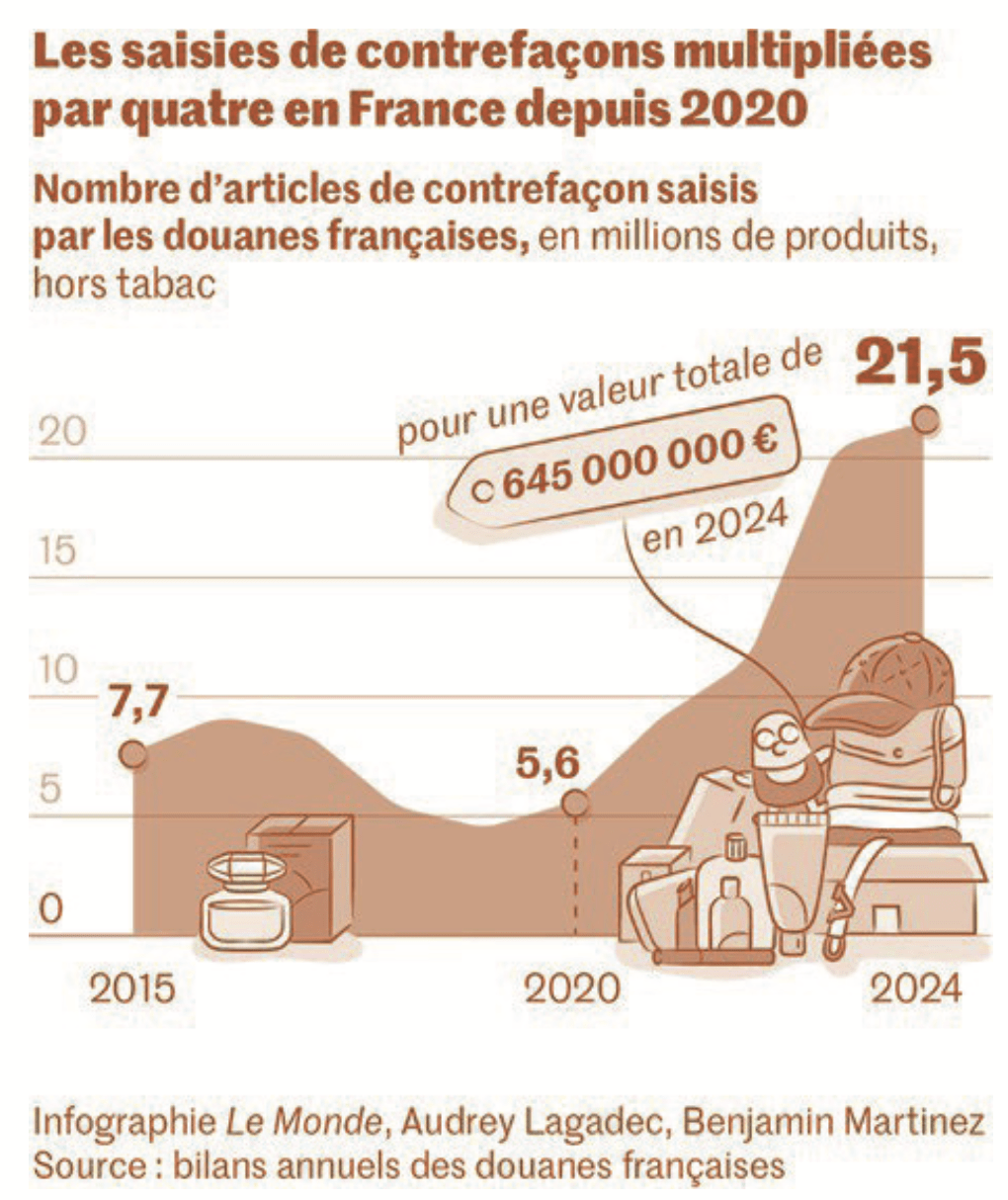 - Produits contrefaits saisis en France : 9 millions en 2021, 11 millions en 2022, 20 millions en 2023 et 21,47 millions de produits saisis en 2024. Une hausse pour la 5e année consécutive. Une augmentation des saisies de 283% en quatre ans.