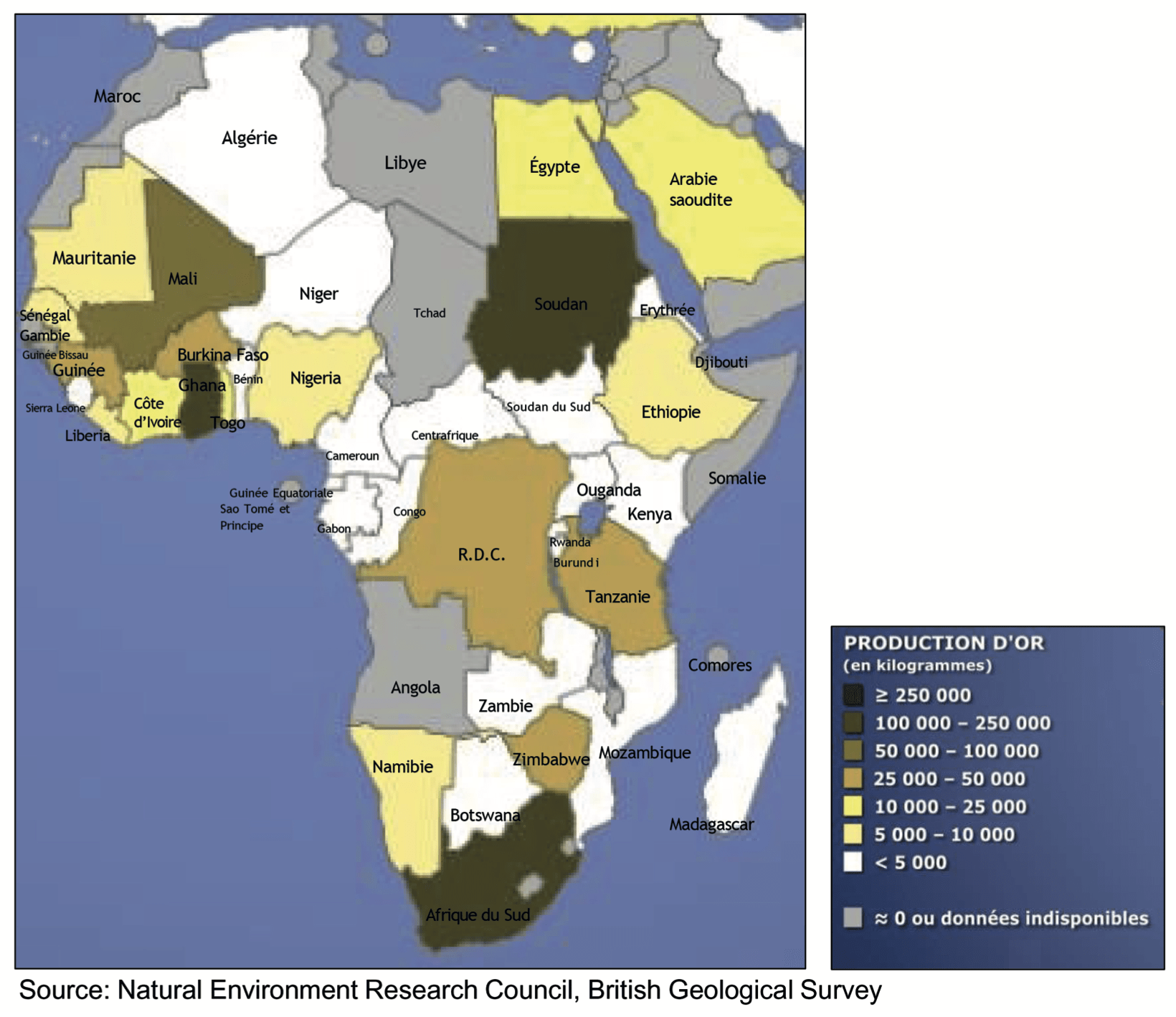 - Chaque année, entre 321 tonnes et 474 tonnes d’or issu de l’extraction minière artisanale et à petite échelle (EMAPE) ne sont pas déclarées à la production en Afrique (ce qui correspond à une valeur comprise entre 23,7 et 35 milliards USD au prix de l’or le 1er mai 2024). En 2022, cela représentait entre 72% et 80% de la production totale d’or d’EMAPE ou entre 32% et 41% de la production d’or totale (EMAPE et industrielle ou semi-industrielle) du continent africain.
