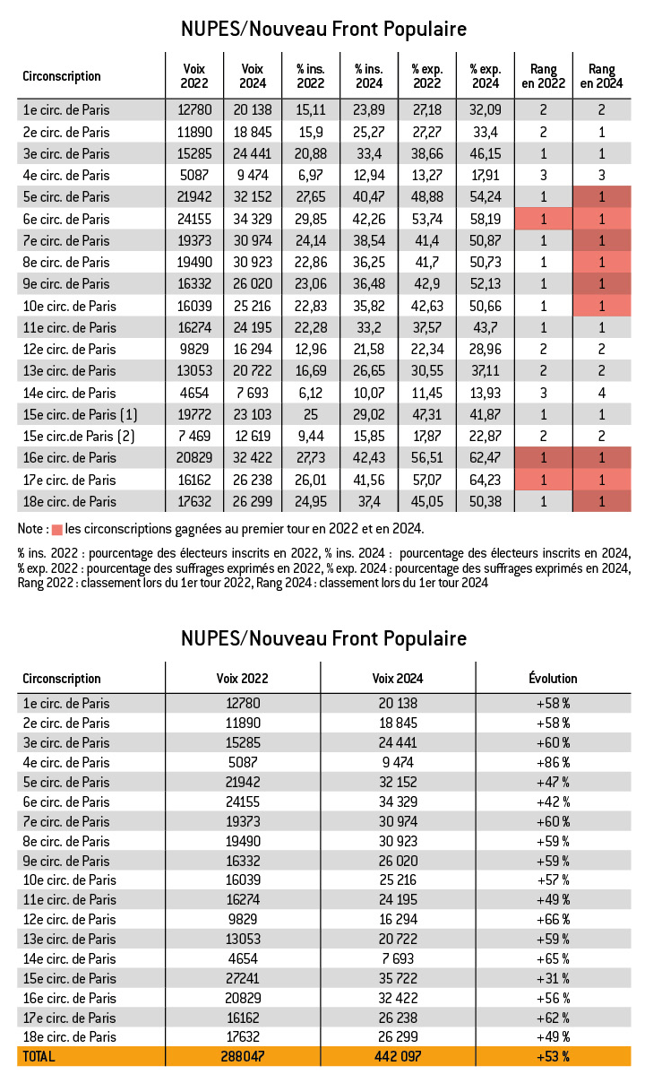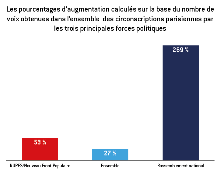 L’augmentation de la participation à Paris a conduit à une augmentation du nombre de voix en faveur du NFP par rapport au nombre de voix obtenu par la NUPES en 2022 (442 097 contre 288 047), avec un pourcentage d’augmentation qui correspond à 53 %2.
