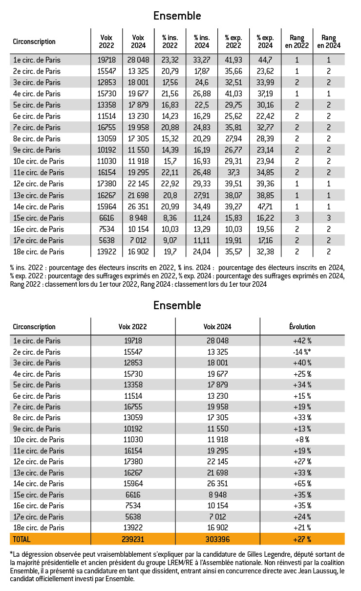 Malgré un recul par rapport à 2022, la coalition Ensemble conserve sa position de deuxième force politique de la capitale, en remportant au second tour les 6 circonscriptions restantes (contre 9 en 2022). Le pourcentage d’augmentation calculé sur la base du nombre de voix nous révèle une progression de 27 %.