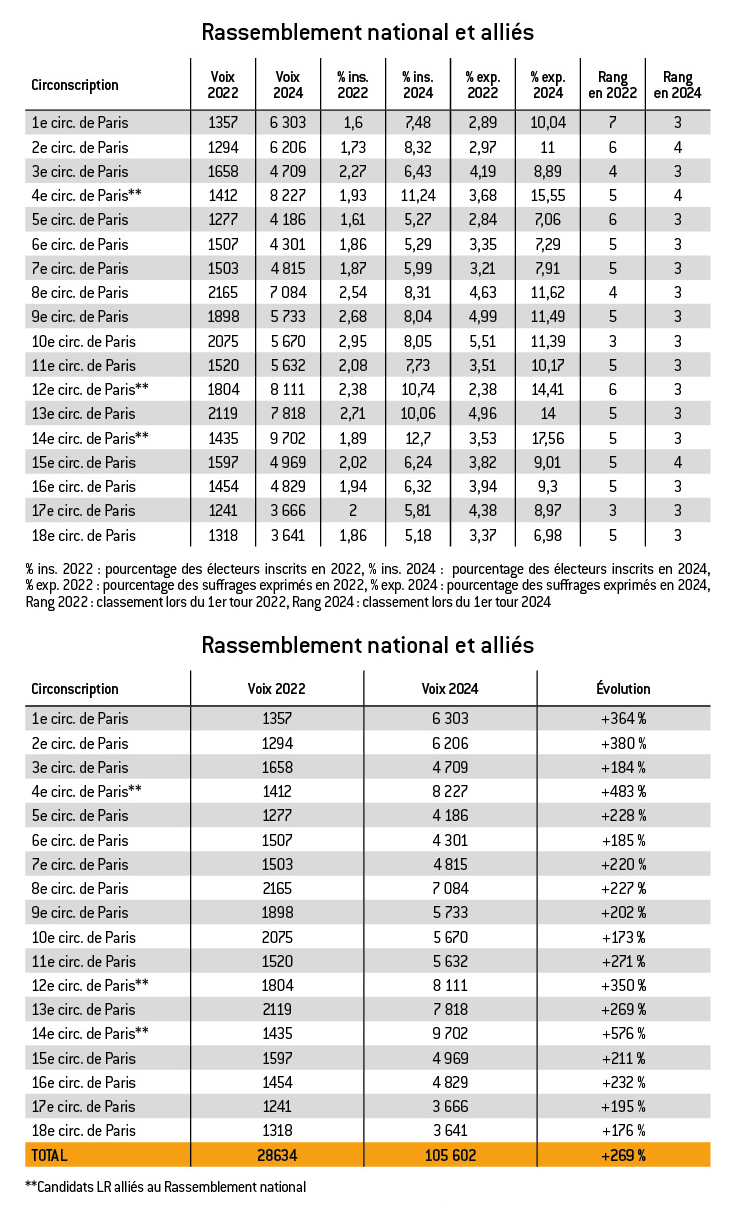 L’ampleur de cette progression est mise en évidence par le nombre de voix recueillies par les candidats du RN à Paris sur l’ensemble des circonscriptions. Celui-ci est passé de 28 634 voix lors du premier tour en 2022 à 105 602 voix en 2024, soit une augmentation de 269 %.