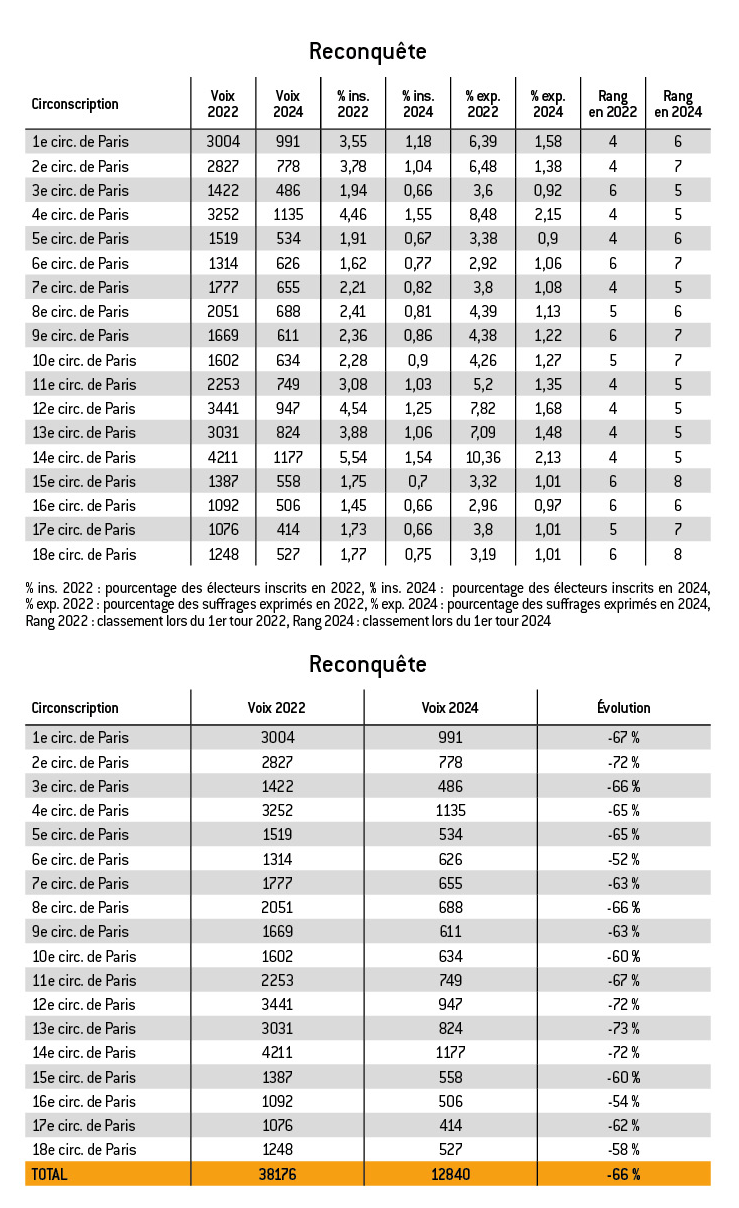 De plus, le résultat historique du Rassemblement National à Paris s’accompagne d’un effondrement de Reconquête !. En 2022, le parti d’Éric Zemmour obtenait 5,13 % des suffrages exprimés, soit 1,28 points de pourcentage au-dessus du RN. En 2024, le score totalisé par les candidats de Reconquête ! sur l’ensemble des circonscriptions parisiennes ne dépasse pas 1,30 %. Le parti Reconquête !, qui faisait figure d’alternative d’extrême droite au Rassemblement National, et qui fut considéré comme plus facilement acceptée par l’électorat de droite des métropoles, a perdu toute son attractivité.