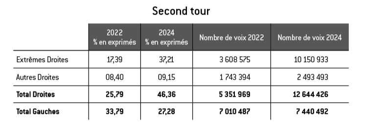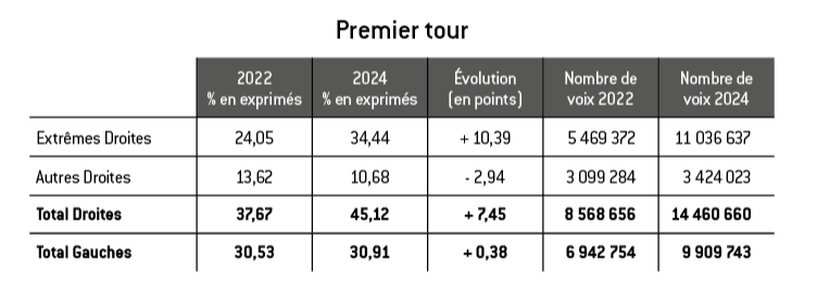 Lors du premier tour des législatives de 2024, les seuls votes d’extrême droite (34,44 %) dépassent le total des votes de gauche (30,91 %). Ce n’était pas le cas lors du premier tour des élections législatives de 2022 ; en effet ; le total des votes de gauche (30,53 %) devançait alors le total des votes d’extrême droite (24,05%).