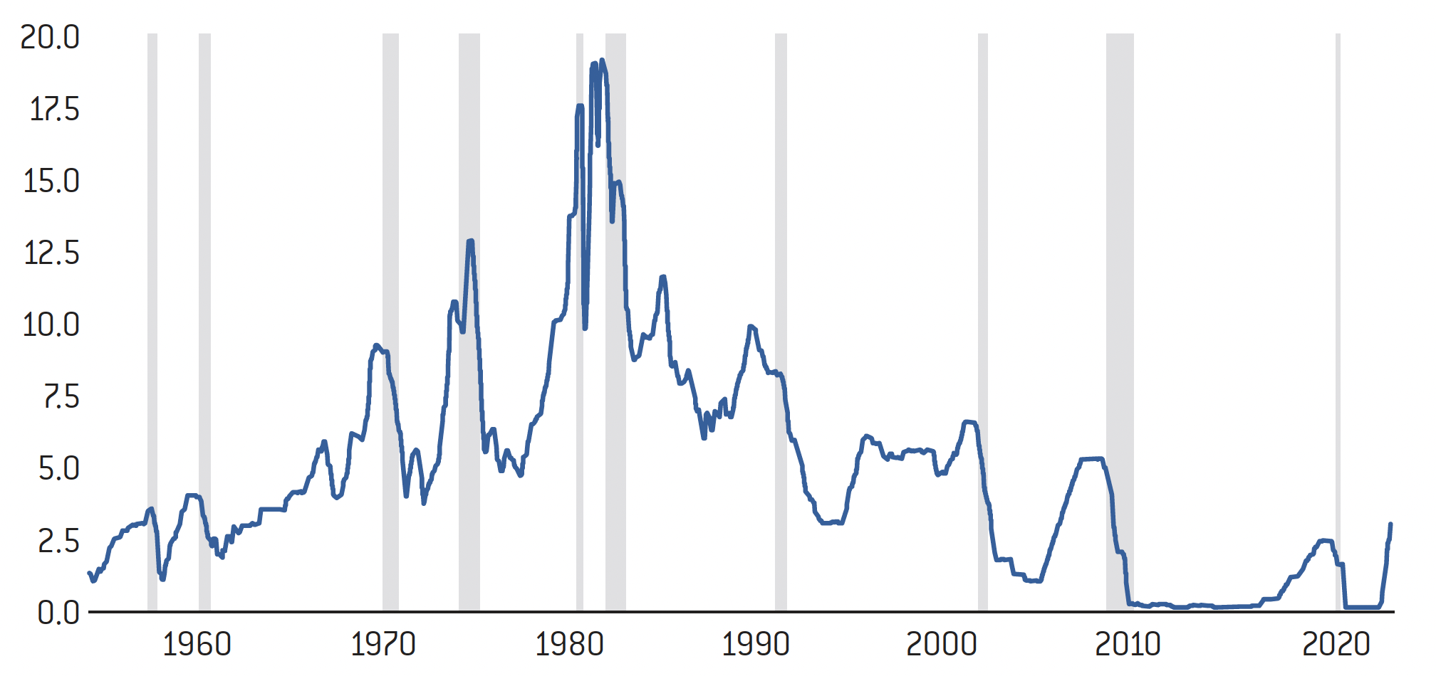 Ce graphique de la Banque Centrale américaine montre la période de Great Inflation, en gris, qui a commencé entre la fin des années 1960 et le début des années 1970. Puis, elle s’est accélérée avec les chocs pétroliers. De façon très intéressante, lorsque l’on est rentré dans cette période inflationniste, on n’y est pas rentré à 10 ou 15 % directement, mais à 5 %, puis on est redescendu à 4 %, puis remonté à 5 % de nouveau, à 6 %, jusqu’à 12 %, puis retombé à 5 %, puis remonté à 15 % en 1979, lors du second choc pétrolier.