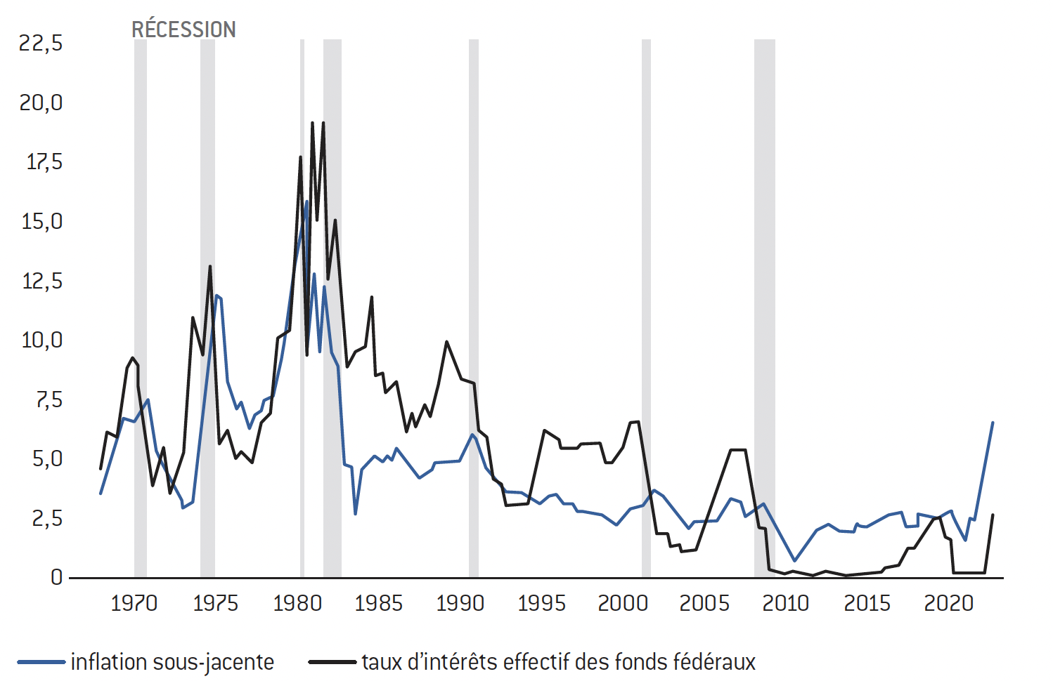 De nos jours, l’inflation est autour de 10 %. Or il y a toujours un effet de décalage entre l’inflation et les taux d’intérêt (ce qui est probablement en train de se passer). Le graphique suivant montre cet effet de décalage entre la courbe de l’inflation en bleu et la courbe des taux directeurs de la Fed en noir, et ce à partir des années 1970. On voit bien cette hausse des taux, très violente, à 20 % et l’inflation à 15 %.