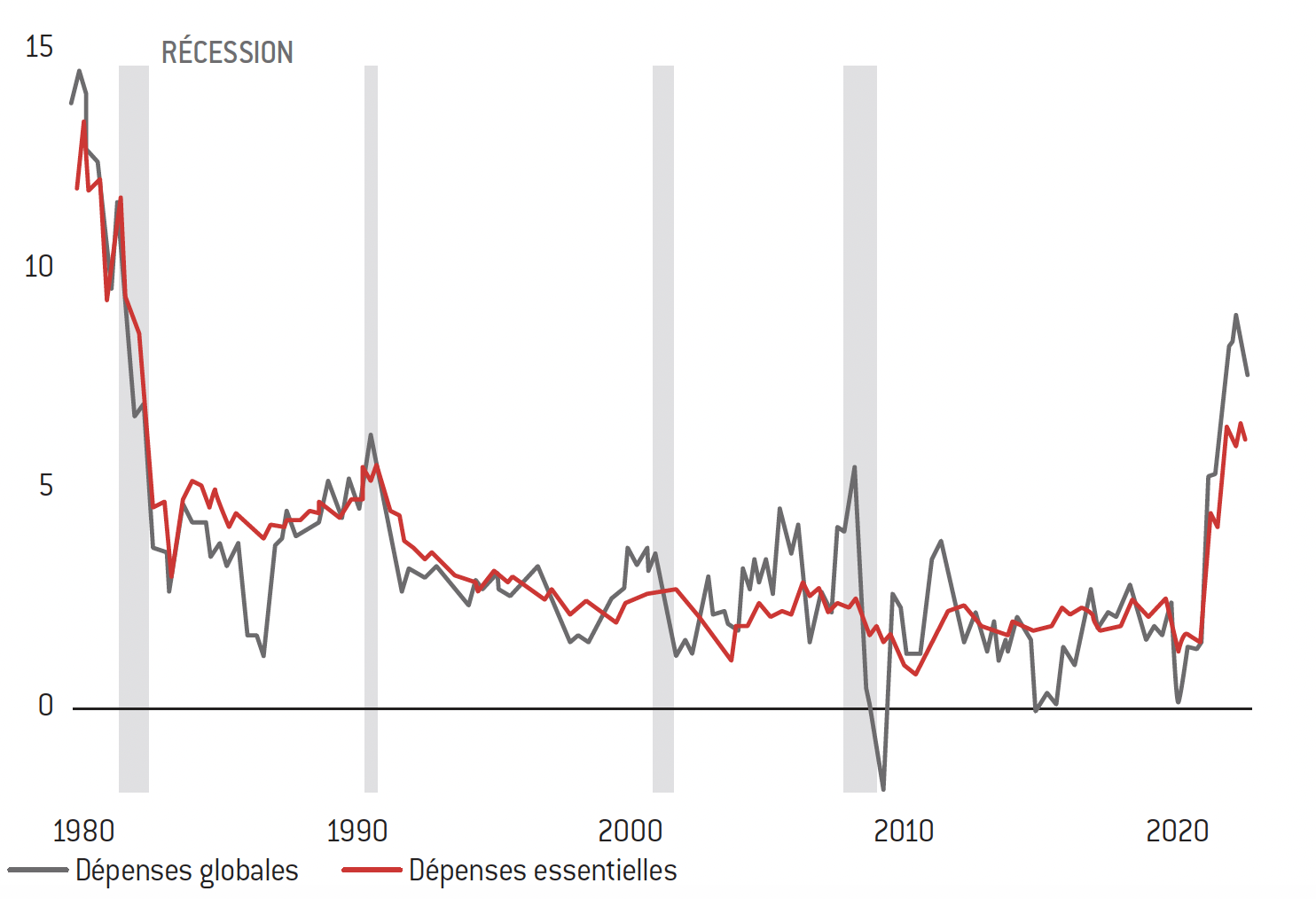 Note : La courbe des « dépenses essentielles » exclut les prix des denrées alimentaires et de l’énergie.