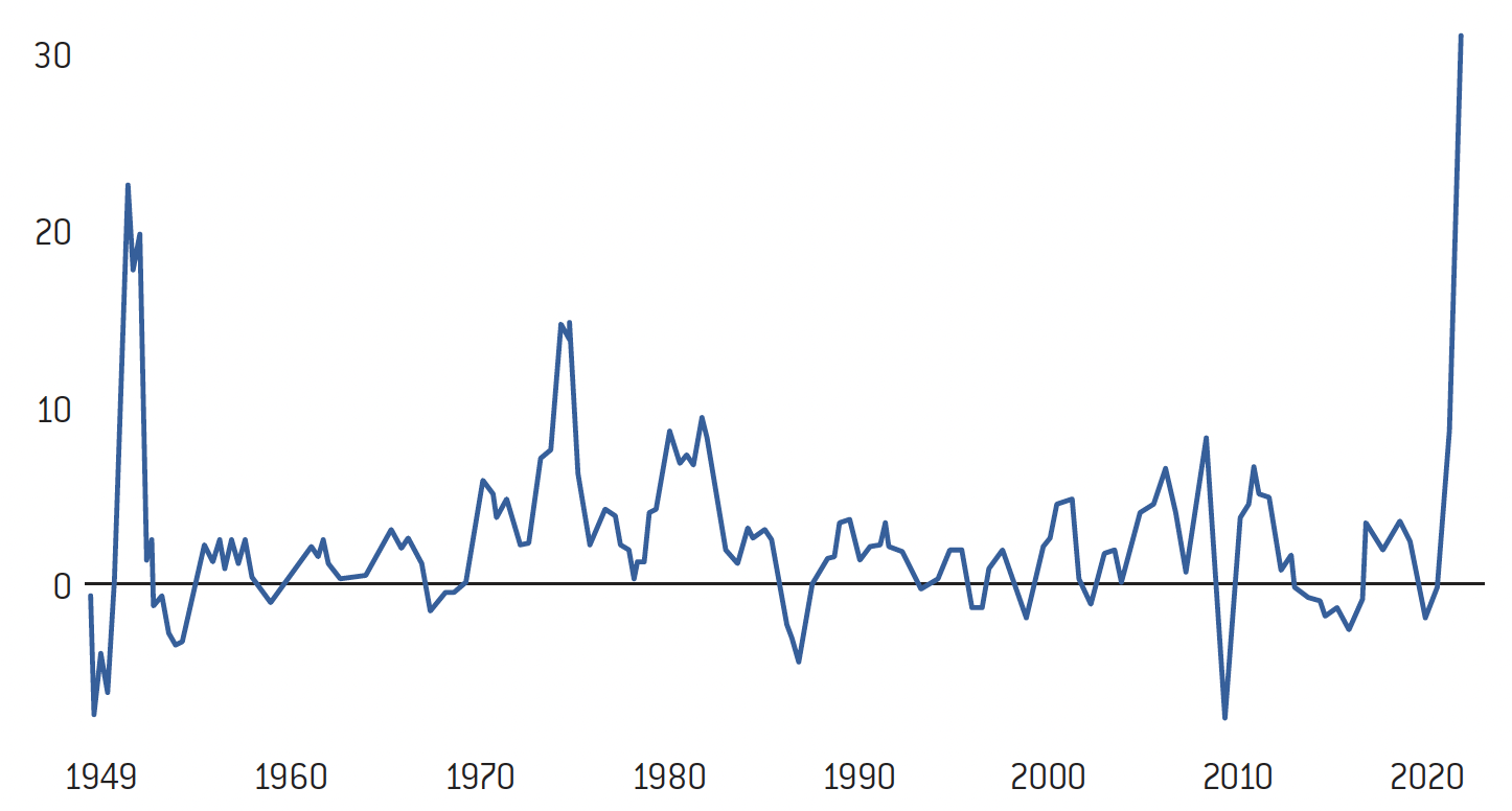 Comme le montre l’inflation des années 1970, elle n’est pas linéaire. Elle ne descend pas et ne monte pas uniformément. Elle reste insaisissable et « pervasive » selon le terme anglais ; elle s’instille dans l’économie et ne disparaît pas aisément, malheureusement. Il serait facile de rétorquer que le pire n’est jamais certain et que l’on devrait parvenir à réaliser un soft-landing de l’économie. Or au niveau des agents économiques eux-mêmes, l’inflation n’est nullement en train de disparaître. Elle se maintient, voire s’accélère dans certains secteurs. On peut l’observer, tout d’abord, au travers des prix à la production : ils représentent une mesure de l’inflation pour les entreprises manufacturières. Le cas de l’Allemagne, par exemple, offre une série longue avec des données publiques. Mais la tendance est à peu près partout la même. Ici, les prix se sont envolés, avec une hausse non pas de 10 ou de 12 %, mais de 30 %. Cela ne veut pas nécessairement dire que l’inflation sur les biens de consommation sera aussi de 30 %, mais cela dit l’ampleur de l’impact de l’inflation sur la structure des coûts de l’entreprise.