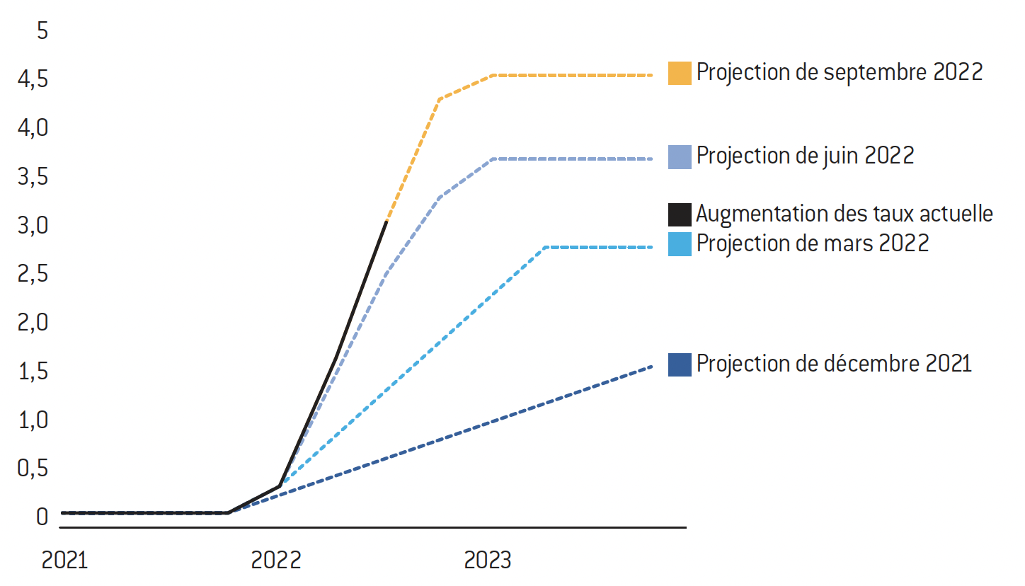 Hausse des taux anticipés par la Fed (en %)