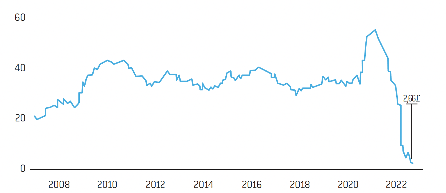 On voit ici le revenu du deuxième quintile le plus faible de la population britannique, qui dispose en moyenne, par semaine, de 35 à 40 livres. Le pic de 50 livres de revenu que l’on observe correspond à l’argent « gratuit » distribué durant le Covid. On constate qu’en 6 mois, les bénéficiaires sont passés d’une moyenne de 35/40 livres et d’un pic à 50 livres à 2 livres.