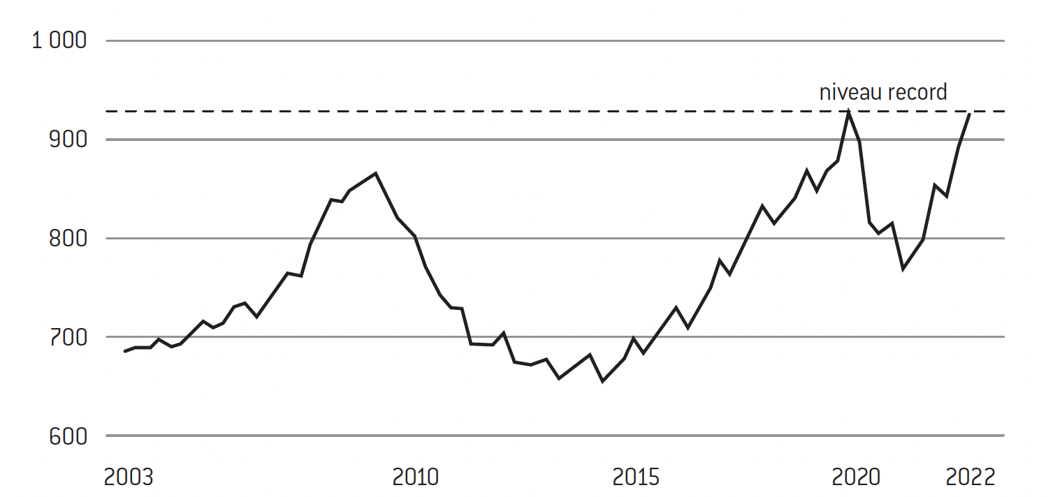 Ce graphique montre une évolution annuelle avec un pic de 30 %, et on a le sentiment que cela s’est stabilisé. Mais si tel est bien le cas, cela signifie que cette inflation de 30 % restera environ à ce niveau. Si l’on était à 100 points avant et que l’on est à 130 points maintenant, et si l’inflation s’est stabilisée, alors elle restera à 130, et donc ne redescendra pas à 100. Voilà pourquoi ce renchérissement des coûts des entreprises devrait se traduire, s’il est stable, par une hausse des prix des biens de consommation. Les entreprises devront répercuter les hausses subies sur les produits qu’ils vendent. En effet, ce n’est pas comme si leurs prix de production étaient montés puis redescendus tout aussi vite.