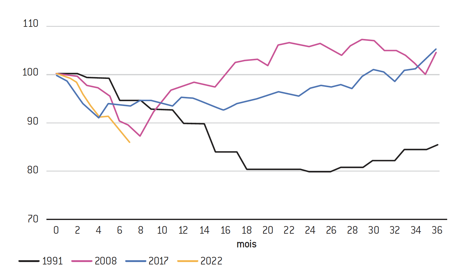 b) L’évolution de l’inflation n’est ni linéaire ni rapide, certaines choses sont différentes, mais le phénomène est relativement similaire. L’histoire semble donc se répéter. On voit que cette inflation a duré, pendant une quinzaine d’années, et qu’elle n’a pas connu une évolution linéaire mais irrégulière. Ces deux constats sont importants. L’inflation que nous vivons actuellement se situe entre 5 % et 10 %. Le pic à 15 % ne paraît pas impossible. Au Royaume-Uni, on est déjà à 12 % environ et en zone euro, autour de 10 %. Cela montre les aspects instables de la situation qui doivent nous mettre en garde contre l’affirmation selon laquelle une inflation à 7,2 % est une bonne surprise en comparaison de l’estimation faite à 7,3 %. Cette différence, d’une part, ne représente même pas la marge d’erreur et d’autre part, l’histoire nous a montré que l’inflation oscille.