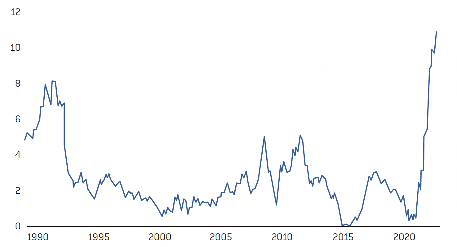 La zone euro, composée de nombreux pays, présente cependant la même tendance : une inflation à 10 %. Et même si l’on exclut l’énergie et l’alimentaire, bien que cela soit dépourvu de sens, la tendance est identique. L’inflation est durablement installée contrairement à ce que l’on entend souvent. On veut se dire « elle s’est stabilisée, on reste à 6 % en France, stabilisée à 10 ou 12 % au Royaume-Uni, etc. ». On prétend également que la remontée des taux, le ralentissement de l’économie et la crise énergétique sont en passe de se calmer, et que tout rentrera bientôt dans l’ordre.