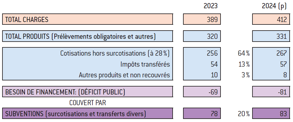 3 – En comptabilité nationale, un déficit étant la différence entre des dépenses publiques et des prélèvements obligatoires 3, la contribution des retraites au déficit d’ensemble des administrations en 2024 4 ressortirait au montant approché de -81 Mds d’euros : 412 Mds d’euros de dépenses et 331 Mds d’euros de prélèvements obligatoires affectés (-69 Md d’euros en 2023).