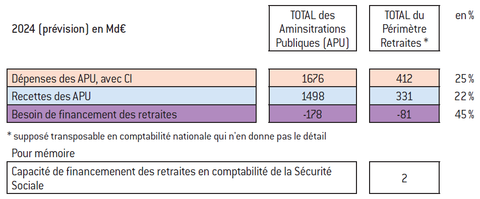 – parce qu’à défaut d’une consolidation des comptabilités de l’État et de la Sécurité sociale dans le cadre plus vaste de l’ensemble des comptabilités publiques, le besoin de financement des retraites n’est pas attribué aux dépenses finales de retraites mais