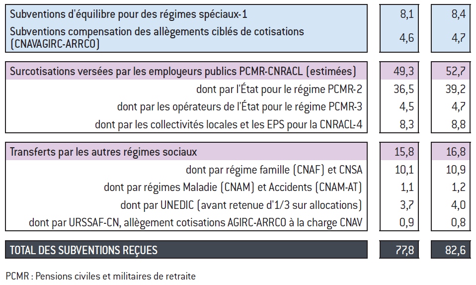 2 – Tous les détails des régimes de retraites sont publiés dans le rapport à la CCSS. Il n’y a donc pas de déficit « caché » des retraites. Mais, pour avoir une vue de l’ensemble, il faut un compte consolidé exhaustif, qui n’est jamais présenté, même à l’appui des réformes. Reconstitué, avec un classement compréhensible des flux, ce compte montre que les ressources sont composées à 64 % seulement de cotisations, 14 % d’impôts affectés et 20 % de subventions des autres administrations. Les subventions, mode de financement spécifique à la branche vieillesse, pèsent sur le solde de chacune des administrations qui les versent.
