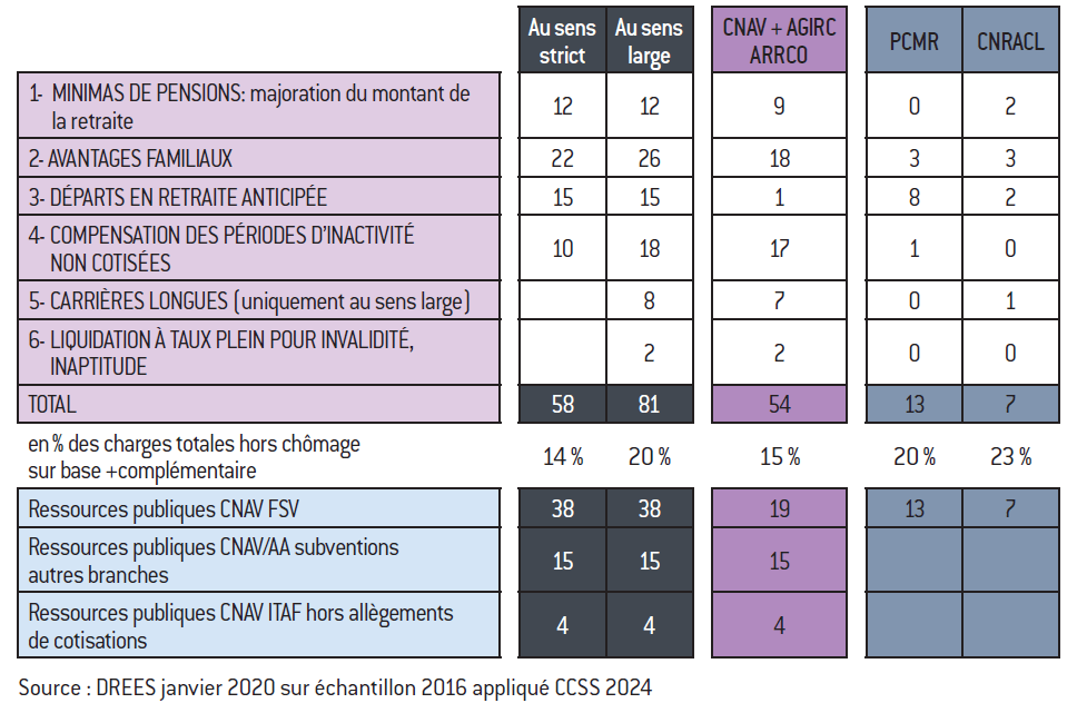 8 – Outre qu’il est compensé par des impôts affectés et des subventions pour 31 Mds d’euros d’allègements d’assiette et de taux spécifiques à la protection vieillesse, le régime général des salariés (base et complémentaire) supporte en effet une large partie des dispositifs légaux d’avantages non contributifs ou « distributifs » que l’on peut évaluer autour des 2/3 11, d’un total estimé de manière imprécise entre 58 Mds d’euros et 81 Mds d’euros. Ces montants justifient l’affectation d’impôts, dont la CSG/FSV, et les subventions mentionnées plus haut provenant d’autres branches de la protection sociale.