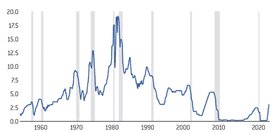 The graph above is from the US Federal Reserve (Fed) and plots the base rate: going back to the post-World War II period, there is a period of rising rates between the 1970s and the 1980s, peaking at 20%, which was the result of the fight against inflation that we had to wage in those years, largely as a result of the two energy shocks. We can also see that since 2000, and even more so since 2010, rates have fallen to zero or have become almost negative. They are indeed “negative” because this graph shows the nominal benchmark rates in the US, which would have to be adjusted for inflation to obtain the real rates for each of these years. And since 2010, inflation has not been at zero. These zero or even negative rates have therefore been in place for a very long period, since 2010 to be precise. This all started during the subprime crisis in 2008, which caused the biggest financial crisis of the post-war period, but they have then continued to be prevalent for almost 13 years.