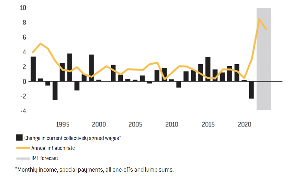 If inflation remains high, which is likely, and we go into negotiated labour agreements, for example with a sliding wage scale, there is a very high risk that companies and governments will be forced to increase wages, especially in our western democracies. We are starting to see this everywhere. In the UK first, but also in the US and Germany. In the following graph, produced by the German trade union IG Metall, one can observe the wage curve over a long period in Germany, in the metal and electrical sectors.