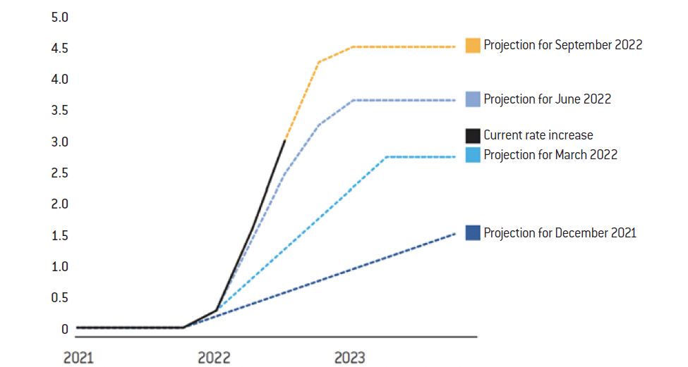 Fed rate hike expectations (in %) – Fed officials have raised their estimates of their rate hike policy