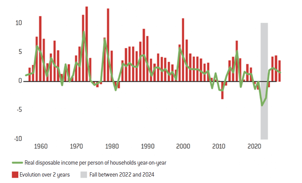 Moreover, the latency effect we mentioned continues to play a role here. Between the moment when the price increase is decided and the moment when these prices are paid by the consumer, some time may pass. Finally, there is what can be called the “full year effect”: when producer prices explode over 3 months, from 100 to 130 points, between September and December, companies do not need to pass on these price increases over the whole year, as they will only have affected their results over 3 months. They have passed on a small part of it over 2022, and will be able to spread it out over the whole of 2023. This is why inflation has this relatively elusive characteristic.