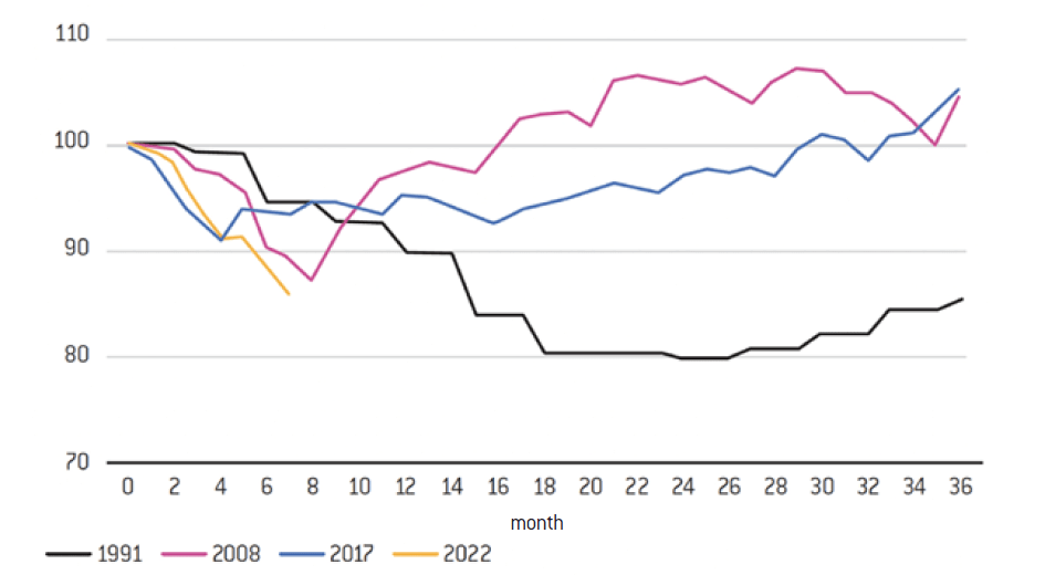 Another way to see how far we have come into this period of probable depression is to look at the housing markets. Of course, there are latencies between different countries, as some borrow at fixed rates, others at variable rates, and over longer or shorter periods. For example, in France, people tend to get into debt over 15 or 20 years at fixed rates. When rates go up, borrowers are not immediately affected, because there is a huge stock of fixed-rate debt, affecting Banks but not necessarily them.
