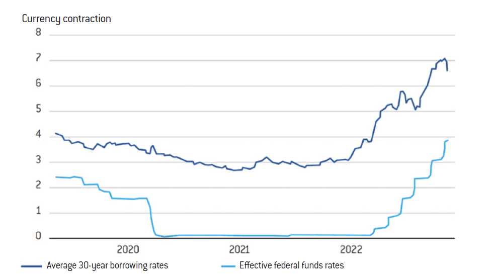 The above chart illustrates house prices for Sweden which has a large proportion of variable rates and is therefore a much more reactive market than France or Germany. Each historical cycles are illustrated: the 1991 property cycle, the 2008 subprime curve, 2017 showing a small correction and finally 2022 (the yellow curve). It appears that the current rate of contraction in house prices is considerable: on a base of 100, after 8 months, we are already at -15%. This is the fastest slope we have ever seen. All these precursory signs show the extent of the current strong and rapid contraction. Another significant example is that of American households taking out a loan to buy a property. The below chart shows two curves: the 30-year mortgage rate and the Fed rate (light blue). We can see that this rise is brutal. We had gone down, on average, to around 3% and we are now up to 7% in less than a year. This curve, which follows that of the key rates, is very important as it directly conditions the property market.