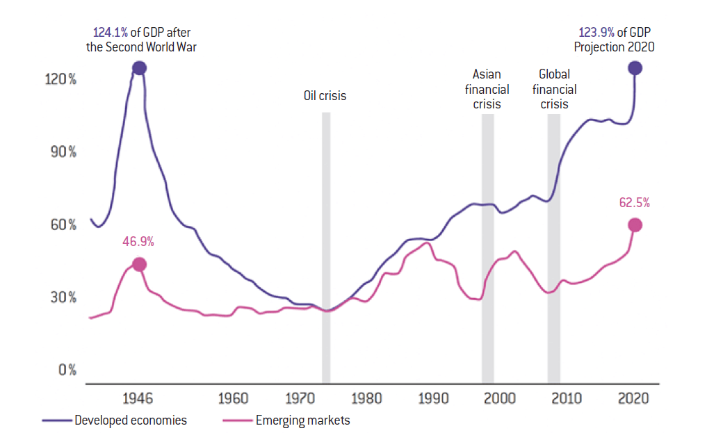 This graph shows a post-World War II peak at 124% of GDP, which is understandable after the world’s largest conflict in history. It distinguishes between advanced economies and emerging markets, with ‘advanced’ being defined the same as today i.e. the Western world as well as Japan and China. In other words, the most powerful economies. We can see that following the Second World War, both as a result of GDP growth and budget surpluses, the debt ratio decreased steeply until the 1970s. The following years become complex, marked by hyperinflation and recession: budget deficits increase in an attempt to revive the economy. However, developed economies managed to remain in the 50-60% range from the early 50’s until roughly the early 2000’s. Overall, the debt ratio rises from 30% to 60%, and rather significantly from the 1970s until the collapse of Lehman Brothers in 2008. This graph perfectly illustrates the monetary exuberance of the last twelve years with the ratio going from 65-70% to its all time high of 124% post WW2. This corresponds to the period of accommodative monetary policy described above. We have reached a level of indebtedness as high as the one found in the aftermath of the biggest war in human history.