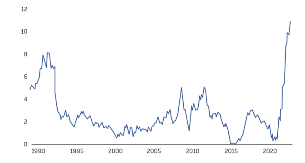 Evidently, other factors contributed to the current spike in inflation: lockdowns, supply-chain issues, the war in Ukraine with the resulting increase in the price of raw materials, etc. Although some could object the sanctions decided against Russia, the largest exporter of raw materials (roughly a third of global annual raw materials production), one cannot pretend to discover the potential economic consequences. Irrespective of this, such an exuberant monetary policy can only have fueled inflationary trends. Christine Lagarde, in an interview in October 2022, indeed expressed her surprise: “inflation has come out of nowhere”.1 This astonishment itself is rather surprising, but the purpose of this note is not to decide whether inflation was mainly due to external shocks or exuberant monetary policy. The fact is inflation is now well installed globally and imposes new constraints when it comes to monetary and therefore fiscal policy.