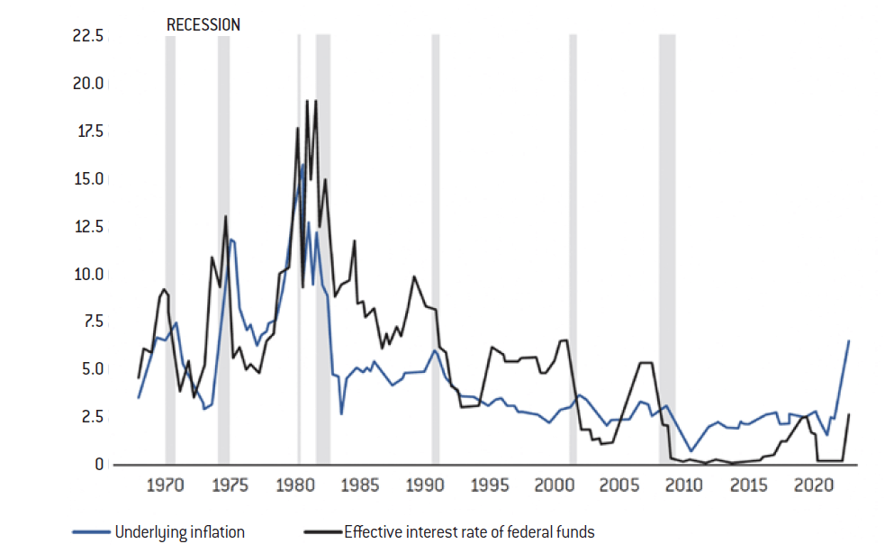 If we look at Graph 1, which shows the Fed’s key base rate over this period, we can see that following the change of the Fed Chair, inflation fell. Indeed, Paul Volker did what any central banker should have done when he saw inflation at 15%: he decided to implement a sharp increase in base rates to 20%. His decision was implacably logical: to stop inflation, real interest rates had to be raised and largely positive. So, if inflation is at 15%, setting base rates at 20% will result in real rates of 5%. This worked, although it brought the economy to its knees. Separately, and still not meaning to add to the theoretical debate about inflation, if monetary policy is the main tool to combat inflation, it becomes difficult to argue that it would not have had any impact in the opposite direction.