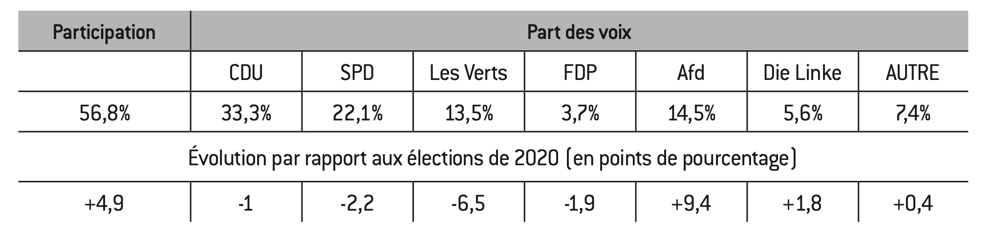 Les élections communales du 14 septembre 2025 montrent que la stratégie de containment de l’Alternative pour l’Allemagne (AfD) développée par la coalition CDU/CSU/SPD au pouvoir ne fonctionne plus. Les sondages interpellent. Dans l’ensemble du pays, l’AfD obtient des scores inquiétants. Le sondage IPSOS du 10 septembre voit l’AfD (25%) devant la CDU/CSU (24%)1. Dans les nouveaux Bundesländer, bastions de l’AfD, ce parti est à 37% en Thuringe, la CDU tombant à 25%. À la veille des élections en Saxe-Anhalt, l’AfD est presque en mesure de pouvoir gouverner seule ce Land (AfD 37%, CDU 27%)2. Si un événement tragique comme un attentat islamiste se produisait peu avant la consultation, pour la première fois depuis 1949, un parti d’extrême droite gouvernerait un Land.