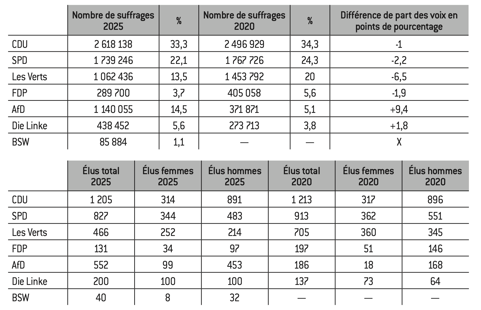 Les élections communales de Rhénanie-Westphalie furent, à juste titre, présentées par la presse comme un instrument de mesure de l’efficacité de la politique gouvernementale mais aussi de l’opposition au Bundestag des Verts et de Die Linke. 13.998.669 électeurs étaient appelés aux urnes et il n’y avait pas de barre de représentativité5. L’analyse des résultats provisoires n’est guère rassurante. Plusieurs dimensions priment : la CDU reste stable, le SPD recule dans ses bastions historiques, les Verts s’affaiblissent fortement, Die Linke progresse marginalement et le BSW échoue à s’établir dans le système politique régional. Le FDP continue sa chute électorale.