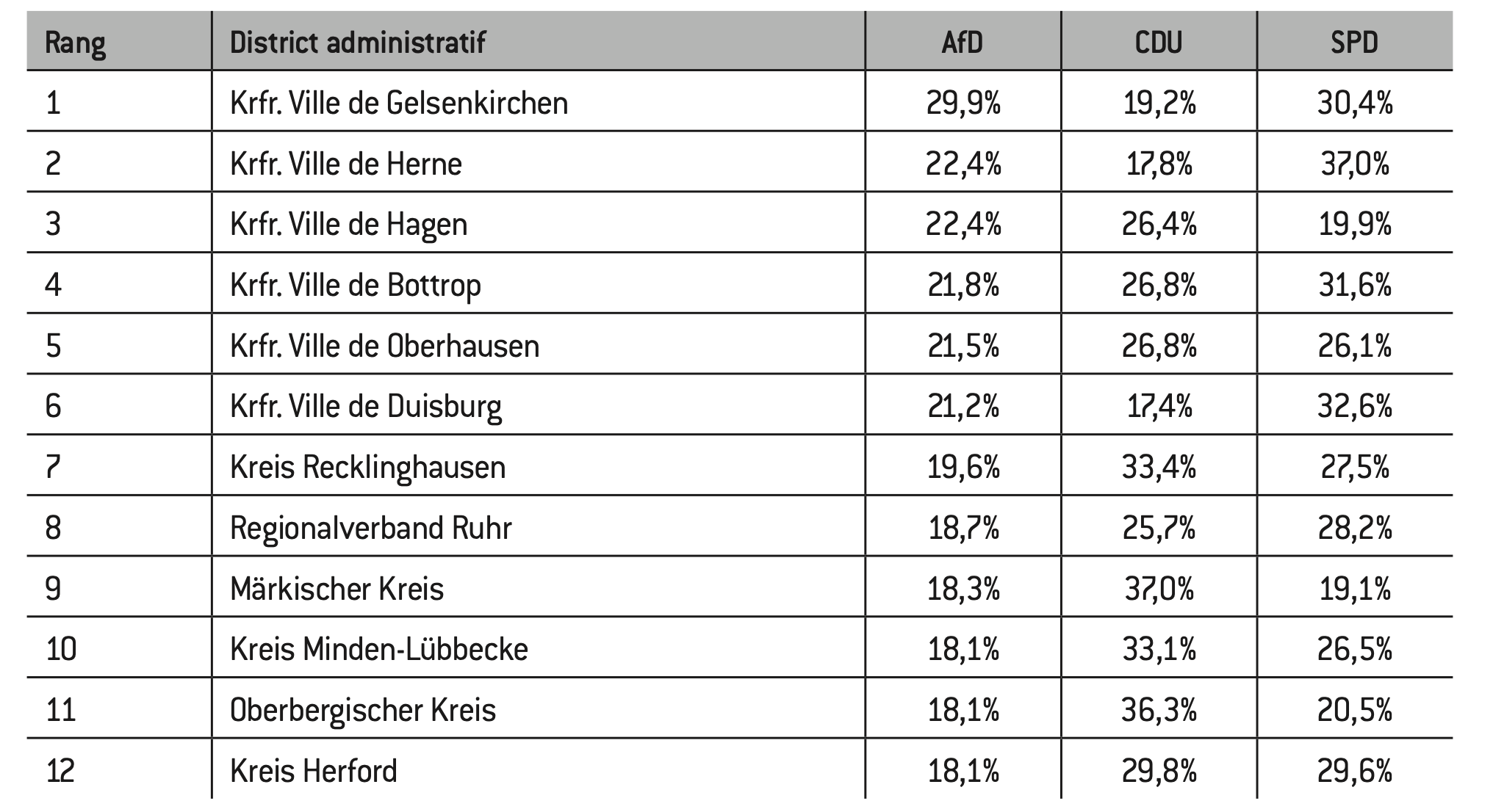 L’AfD est parvenue au second tour dans trois grandes villes (Gelsenkirchen, Duisburg et Hagen). À Gelsenkirchen, le candidat de l’AfD a obtenu 29,8% des voix au premier tour. La candidate du SPD a obtenu 37% des voix. À Duisburg, l’AfD a obtenu 19,7% des voix et s’est classé deuxième derrière le maire SPD qui a obtenu 46% des voix. À Hagen, le candidat de l’AfD s’est qualifié pour le second tour avec 21,2% des suffrages. Le SPD et la CDU ont annoncé vouloir soutenir les candidats démocrates opposés aux candidats de l’AfD lors du second tour. Le ministre-président CDU Hendrik Wüst a réaffirmé qu’il n’y aura aucune coopération avec l’AfD au niveau communal6.