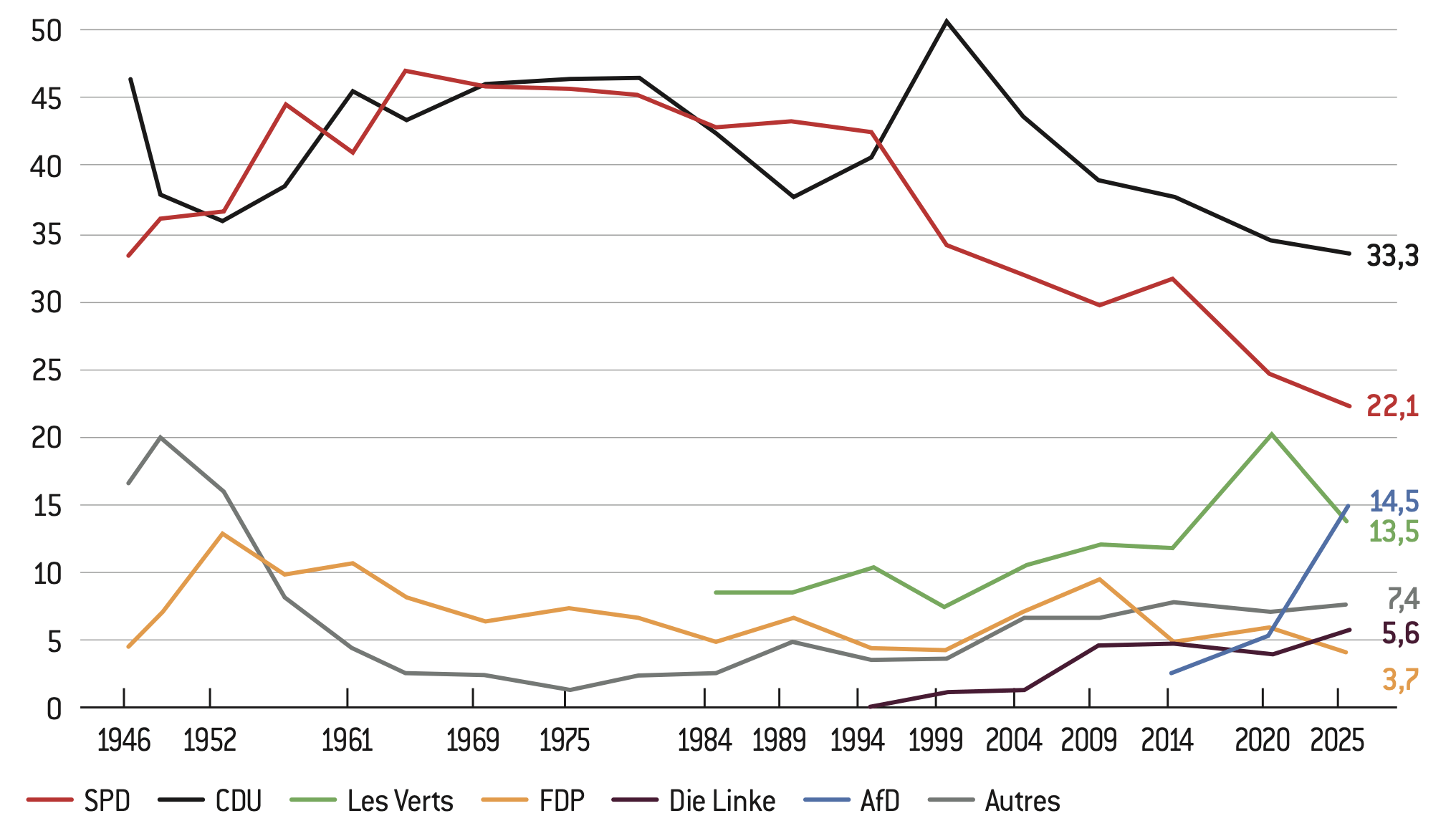 En conclusion, cette élection devrait intensifier les conflits internes de tous les partis démocratiques. L’unidimensionnalité écologique des Verts devient une faiblesse idéologique, que vient renforcer sa ligne « militariste » de soutien à l’Ukraine. Pour se stabiliser, le parti devra abandonner son style de la coalition Ampel (regroupe le SPD, le FDP et les Verts) et admettre qu’il n’est plus au gouvernement. Tout comme le SPD, il devra répondre à la montée en puissance de Die Linke, parti qui érode peu à peu son potentiel électoral. Le BSW, réduit à ses maigres bastions électoraux des nouveaux Bundesländer, est lui aussi menacé par Die Linke et peine à se faire entendre au-delà de sa campagne pacifiste mais excessivement pro-russe. Pour tenter de regagner son électorat traditionnel, le SPD devra vraisemblablement aller « vers la gauche », ce qui conduira à des tensions de plus en plus fortes avec la CSU, mais également avec la base CDU qui reproche au chancelier Merz d’être prisonnier de sa coalition avec le SPD. La tentative d’interdiction de l’AfD que souhaite la majorité des partis représentés au Bundestag reste une inconnue juridique, qui a en outre l’inconvénient de radicaliser les électeurs des nouveaux Bundesländer ainsi que la masse grandissante des citoyens mécontents de la situation politique, sécuritaire, migratoire et économique23.