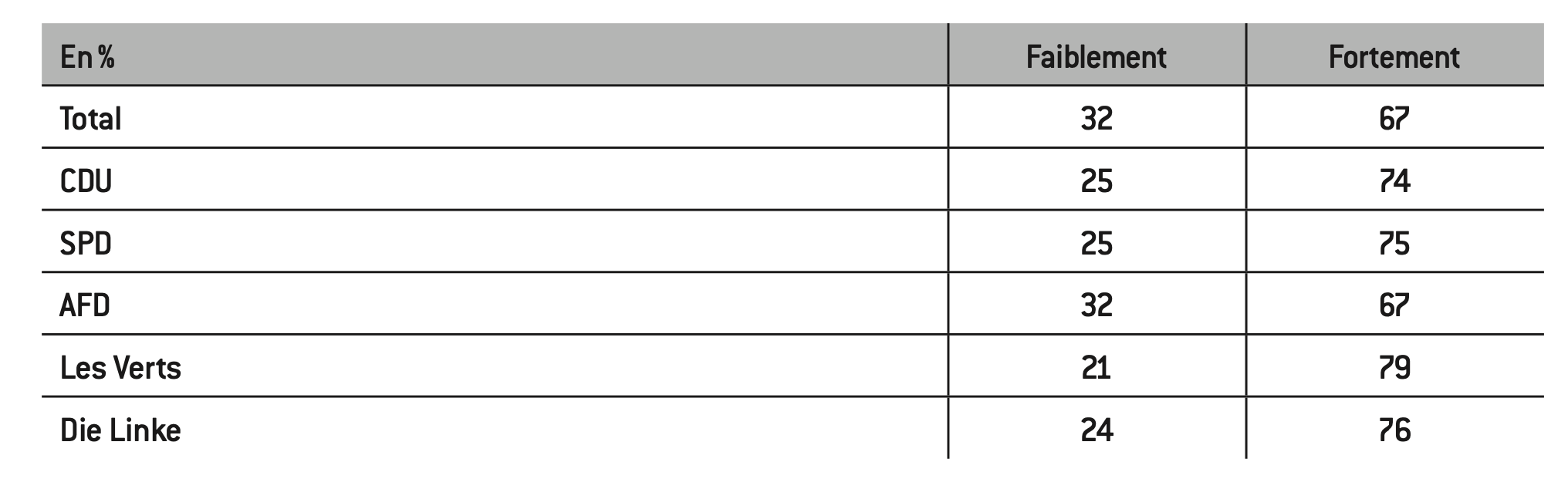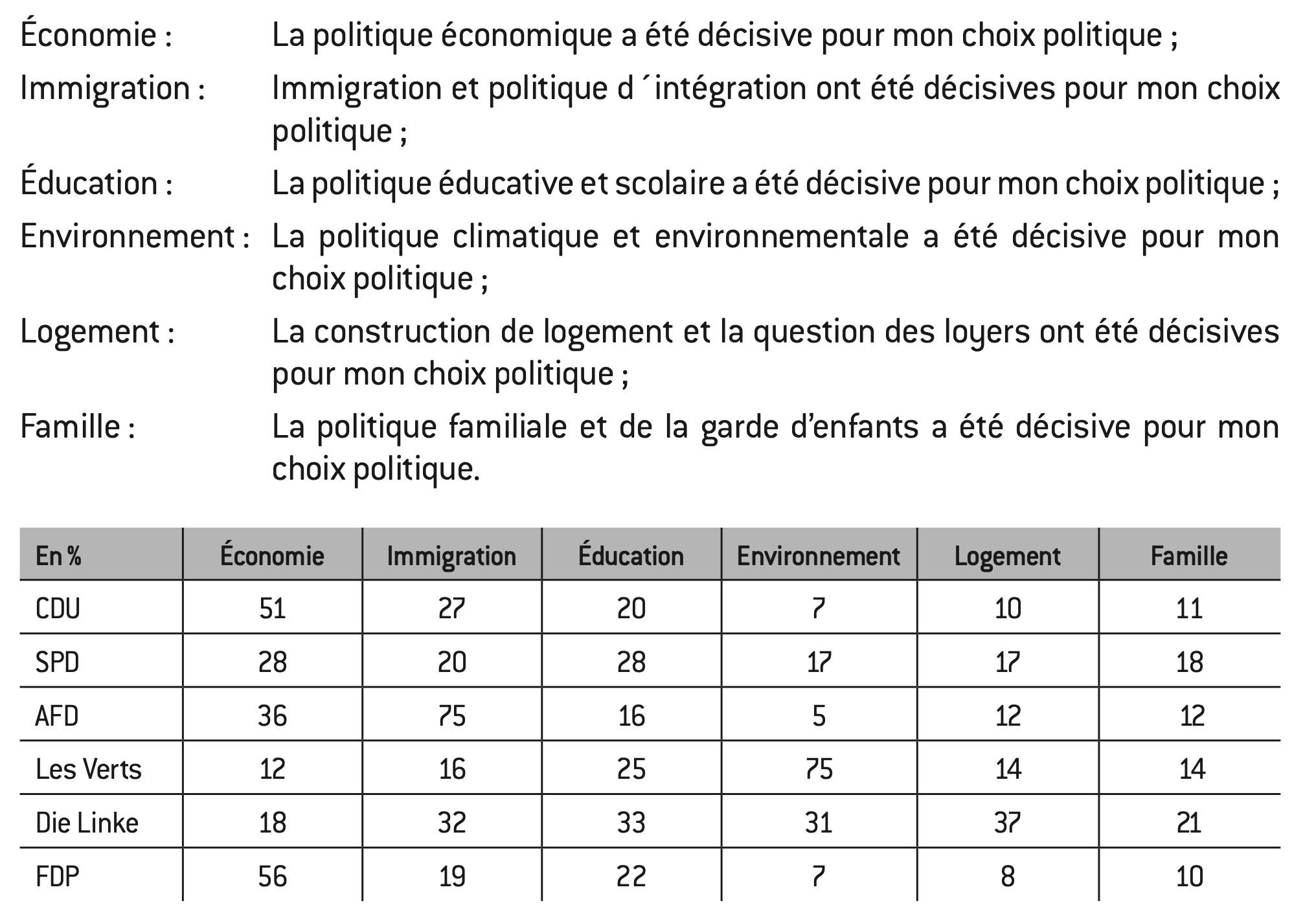 La question économique a été déterminante pour 56% des électeurs FDP, 51% de ceux de la CDU et pour 36% des électeurs de l’AfD17. Les électeurs AfD sont avant tout motivés par la question migratoire, alors qu’elle ne joue qu’un rôle secondaire pour le reste des votants, à l’exception de Die Linke qui défend une politique d’ouverture des frontières. 39% des électeurs de l’AfD déclarent que l’affirmation « la sécurité et l’ordre public ont été déterminants dans mon choix électoral » était « vraie », alors que 28% seulement des électeurs de la CDU, 8% de ceux de Die Linke et 5% des électeurs des Verts sont de cet avis18.