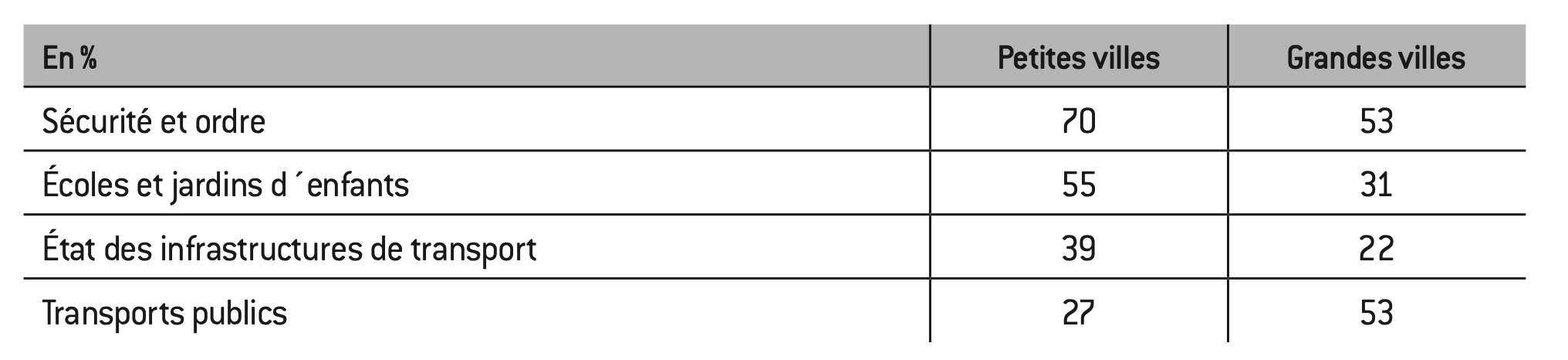 Infrates Dimap a comparé l’avis des électeurs des petites communes de moins de 20.000 habitants à celui des personnes interrogées dans les grandes villes de plus de 100.000 habitants. « Quatre thèmes font apparaître des différences notables : alors que 70% des habitants des petites communes donnent une évaluation positive du maintien de l’ordre public et de la sécurité, ce n’est le cas que de 53% des habitants des grandes villes »13.
