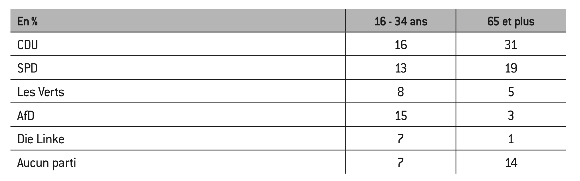 La CDU jouit de la confiance des électeurs âgés, à savoir 31% des plus de 64 ans pour 16% seulement chez les moins de 35 ans. La CDU est talonnée par l’AfD chez les jeunes (15%). Le SPD est à 13%, les Verts à 8%, Die Linke à 7%. Chez les plus de 65 ans, Die Linke est inexistante. Cette progression chez les jeunes de l ́AfD est un gage d’avenir pour ce parti qui pourra trouver de nouvelles générations de sympathisants et d’adhérents.