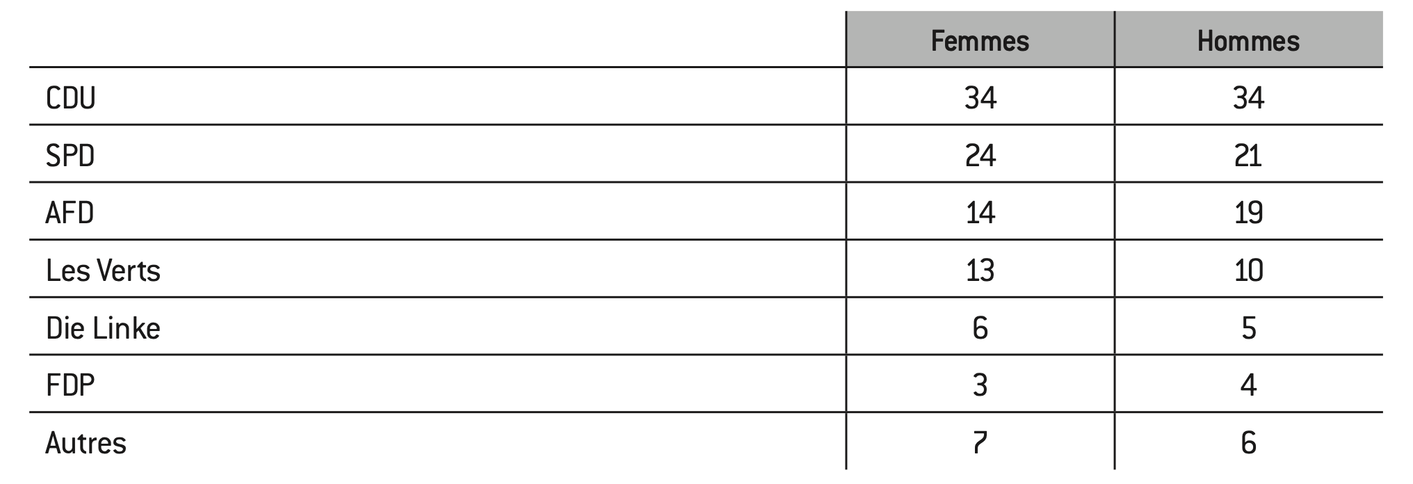 Si la CDU a obtenu 34% des voix chez les hommes et les femmes, le SPD est légèrement préféré par les femmes (24%), alors que les hommes n’atteignent que 21%. L’AfD est traditionnellement plus forte chez les hommes (19%, pour 14% seulement chez les femmes)14.